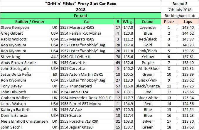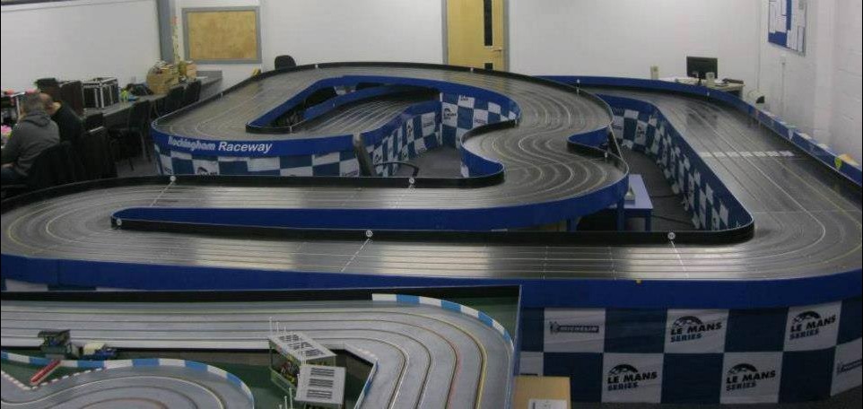 Our ‘Raceway’ track is designed for BSCRA-type 1/32 and 1/24 and UKRRA Retro 1/24 racing. It’s a very fast 117-foot six-lane braided wooden track with a smooth gloss painted surface. Race control is through the latest version of the SlotMaster race management system. Controllers are connected through the usual BSCRA 3-pin 2 amp plugs that are standard in UK slot racing clubs.